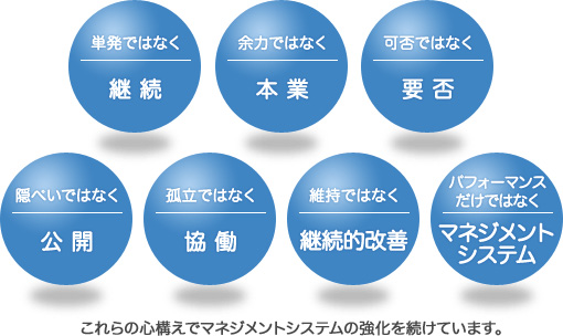 そのうえで、当社の環境方針の中で、2010年11月に発行された国際ガイダンス規格ISO26000を尊重しつつEMSをCSRマネジメントに発展させることを宣言しています。
